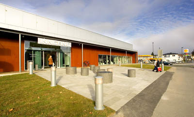 Fasader i prefab. betongelementer nybygg og klimavegger med platekledning på ombygget del. Alle betong-, tømmer-, mur- og pussarbeider samt grunnarbeider utført i egenregi.