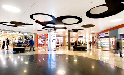 Torgareal vest med gulv av naturstein og dekorelementer i tak/himlinger.