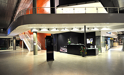 Hovedinngangsparti/foaje med gangbro fra storsal over til galleri i 2. etasje.