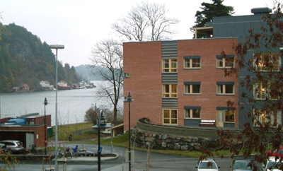 Nybygg på totalt 4600 m2 over 4 plan. Bæresystem utført i plaststøpt betong med takterrasse og teknisk rom på tak. Fasader av klimavegger forblendet med tegl og platekledning. Alle betong-, tømmer-, mur- og pussearbeid er utført i egenregi. Fasade nord-vest, 30.10.2003